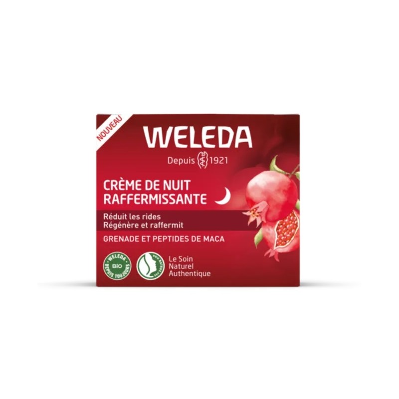 La Crème de Nuit Raffermissante Grenade & Maca de Weleda est spécialement formulée pour les peaux manquant de fermeté.