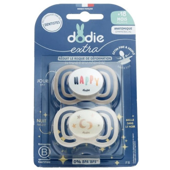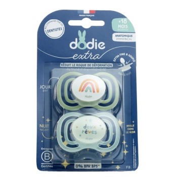 • Lot de 2 sucettes : 1 jour + 1 nuit avec bouton phosphorescent pour la retrouver facilement dans le noir