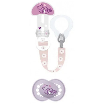 Kit comprenant une sucette anatomique en silicone et un attache-sucette adaptable, conçu pour les enfants dès 18 mois.