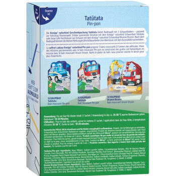 • Pin-Pon (Camion de pompier) : bain rouge pétillant au parfum fruité, enrichi en huile de jojoba, extrait d’amande douce et huile d’orange douce, pour hydrater et protéger la peau.