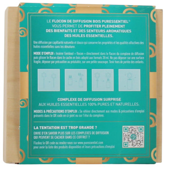 Coffret complet associant un diffuseur en bois par capillarité et un complexe d’huiles essentielles pour une ambiance chaleureuse et relaxante.