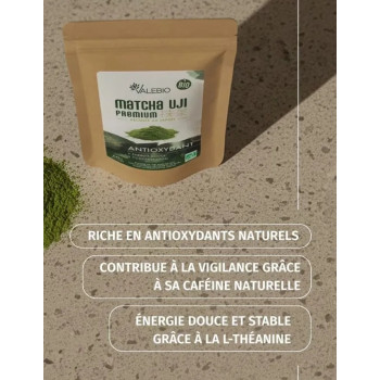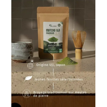 • 100 % thé vert matcha bio issu de la région d’Uji, célèbre pour la qualité de ses thés
