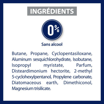 BUTANE, PROPANE, CYCLOPENTASILOXANE, ALUMINIUM SESQUICHLORHYDRATE, ISOBUTANE, ISOPROPYL MYRISTATE, PARFUM, DISTEARDIMONIUM HECTORITE, 2-METHYL-5-CYCLOHEXYLPANTHENOL, PROPYLENE CARBONATE, DIATOMACEOUS EARTH, DIMETHICONOL, MAGNESIUM TRISILICATE