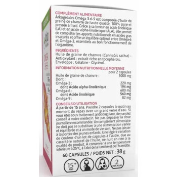 Complément alimentaire à base d’huile de graine de chanvre 100 % pure et pressée à froid, riche en acides gras essentiels Oméga-3 et Oméga-6.