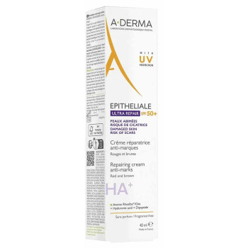 Crème réparatrice 2-en-1 visage et corps qui favorise la réparation des peaux abîmées tout en offrant une très haute protection solaire SPF50+ pour limiter les marques cicatricielles et pigmentaires.
