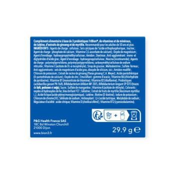 CELLULOSE, SELS CALCIQUES DE L’ACIDE ORTHOPHOSPHORIQUE, INULINE, PHOSPHATE DE CALCIUM, VITAMINE C (L-ASCORBATE DE CALCIUM), OXYDE DE MAGNÉSIUM, HYDROXYPROPYLMETHYLCELLULOSE, AMIDON, DEXTROSE, MONO- ET DIGLYCÉRIDES D’ACIDES GRAS, HYDROXYPROPYLCELLULOSE, NICOTINAMIDE, POLYVINYLPYRROLIDONE, CARBOXYMÉTHYLCELLULOSE DE SODIUM RÉTICULÉE, VITAMINE E (ACÉTATE DE DL-α-TOCOPHÉRYLE), SIROP DE GLUCOSE, MALTODEXTRINE, SULFATE FERREUX, SELS DE MAGNÉSIUM D’ACIDES GRAS, DIOXYDE DE SILICIUM, TALC, AMIDON MODIFIÉ, CHLORURE DE POTASSIUM, EXTRAIT DE RACINE DE GINSENG, ACIDE PANTOTHÉNIQUE, OXYDE DE ZINC, GOMME D’ACACIA, VITAMINE B6, VITAMINE B1, VITAMINE B2, LACTOBACILLUS GASSERI PA 16/8, BIFIDOBACTERIUM BIFIDUM MF 20/5, BIFIDOBACTERIUM LONGUM SP 07/3, SULFATE DE MANGANÈSE, VITAMINE A, EXTRAIT DE MYRTILLE, ACIDE FOLIQUE, LUTÉINE, BIOTINE, IODURE DE POTASSIUM, CHLORURE DE CHROME (III), SÉLÉNATE DE SODIUM, MOLYBDATE DE SODIUM, VITAMINE D, VITAMINE B12