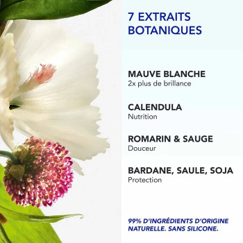 • Enrichie en 7 extraits botaniques (mauve, romarin, sauge, calendula, bardane, saule, etc.)