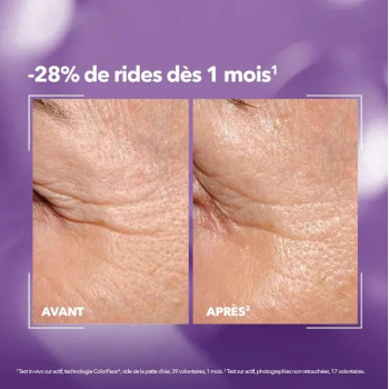 • Défroisse les rides et ridules dès la première heure grâce aux Sucres Tenseurs