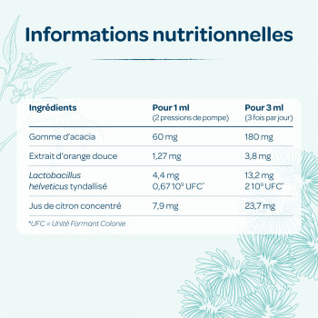 GOMME D’ACACIA, EXTRAIT DE CITRON, EXTRAIT DE FLEUR D’ORANGER, LACTOBACILLUS HELVETICUS HA122 TYNDALISÉ
